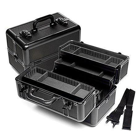 Organize and store all your beauty essentials in one chic case designed with faux crocodile print. The glossy black finish with chrome detailing adds drama and sophistication to this convenient organizer. Use the adjustable fold-out trays and multiple compartments to house your makeup, nail products, tools, and more. The bottom level has adjustable compartments for storing multiple size products and the two-tier stacking tray on both sides allows plenty of room for full-size products to stand upright. This train case comes with its own lock and key to keep your items safe and sound and the professional grade construction is highly durable for on the road bumps and bruises.